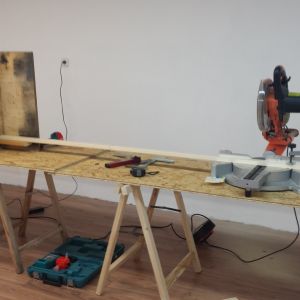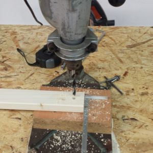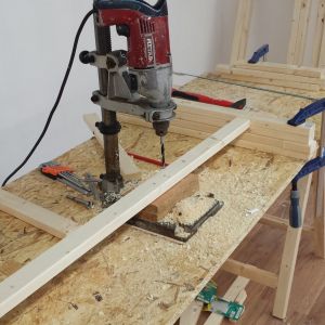 Aus Holzböcken und OSB Platten habe ich mir eine provisorische Werkbank hergerichtet und erst mal die Kappsäge darauf fixiert. Mit einem Winkelbrett habe ich dann einen Anschlag realisiert, denn ich hatte ja viele Latten auf die gleiche Länge zu sägen. Dadurch erhielt ich die notwendige Wiederholgenauigkeit und ich musste nicht jede Latte einzeln abmessen. Nachdem alle Latten ihre richtige Längen hatten ging es mit dem Bohrmaschinenständer ans bohren der Löcher für die Gewindestangen.