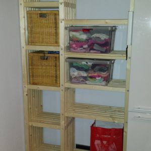 Wir hatten in der Küche hinter der Türe ein 0815 Lutz Regal mit einer Standardbreite. Das heißt wir haben einiges an möglichem Stauraum verschenkt. Also musste eine neue neue, bessere Lösung her.