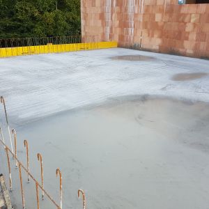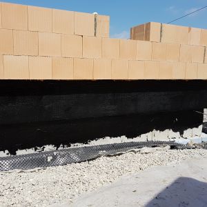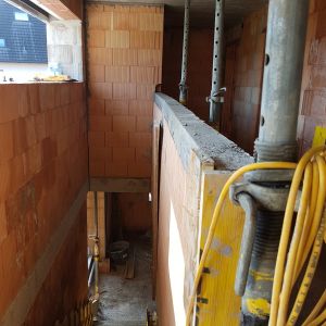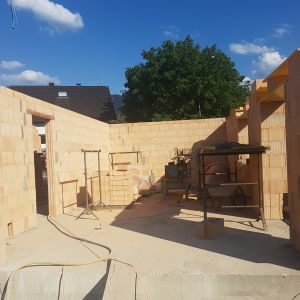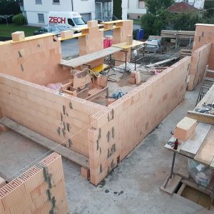 Mit der Kellerdecke war der Keller jetzt fertig – jetzt wurde mit den großen Ziegeln das Erdgeschoss gemauert. Wir hatten nach viele Recherchen, Gesprächen und Angeboten beschlossen, dass wir monolithisch bauen werden. Dafür haben wir einen 49-dicken Ziegel, der innen mit Steinwolle gedämmt ist, ausgewählt.